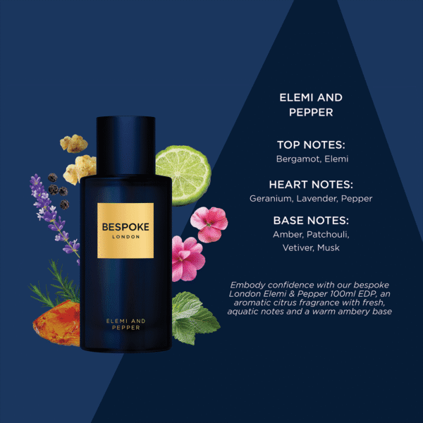 Make a strong and confident impression with Bespoke London Gold Collection Elemi and Pepper EDP, available at Elite Glow UAE.