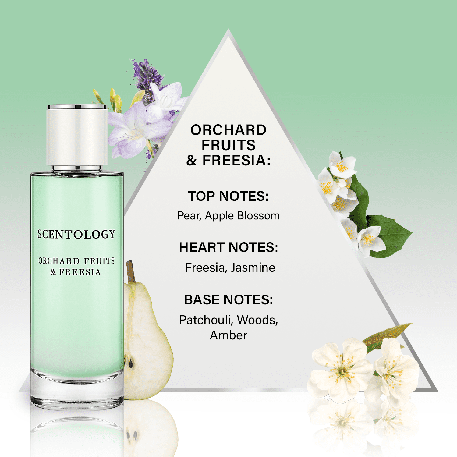 Scentology Orchard Fruits Freesia Eau de Parfum 100ml. Inspired by the lightness of spring and the richness of orchard blossoms, this fragrance is a perfect everyday companion for the modern woman.With its alluring top notes, romantic floral heart, and warm base, this Eau de Parfum brings sophistication and joy to every spritz.