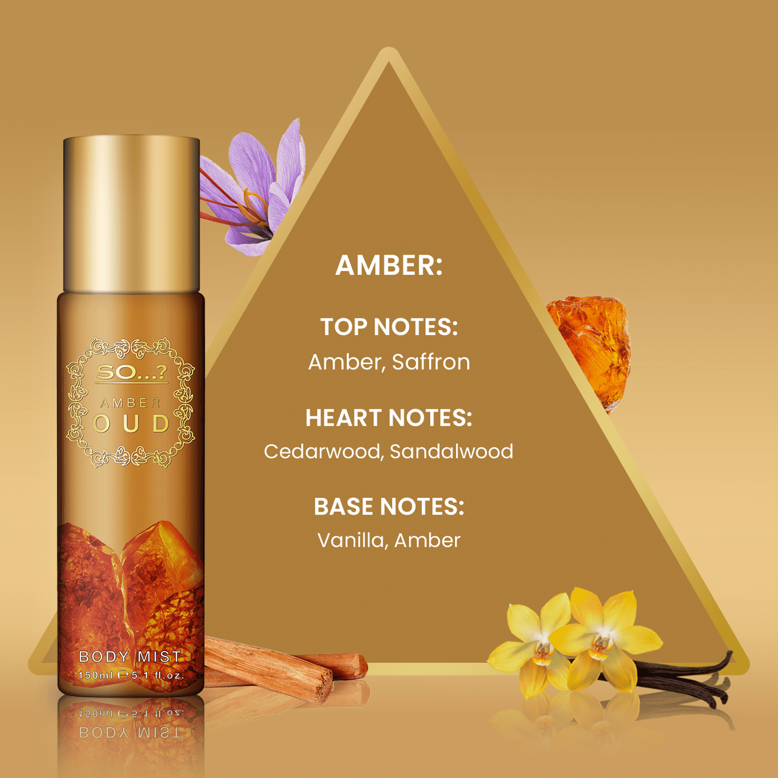 So Amber Oud Body Mist Fragrance Spray for Women 150ml opens with a crisp blend of amber and saffron, giving way to a heart of rich sandalwood and deep cedarwood. The fragrance settles into a softly sweet base of amber and vanilla, creating a warm, luxurious scent that lingers beautifully.