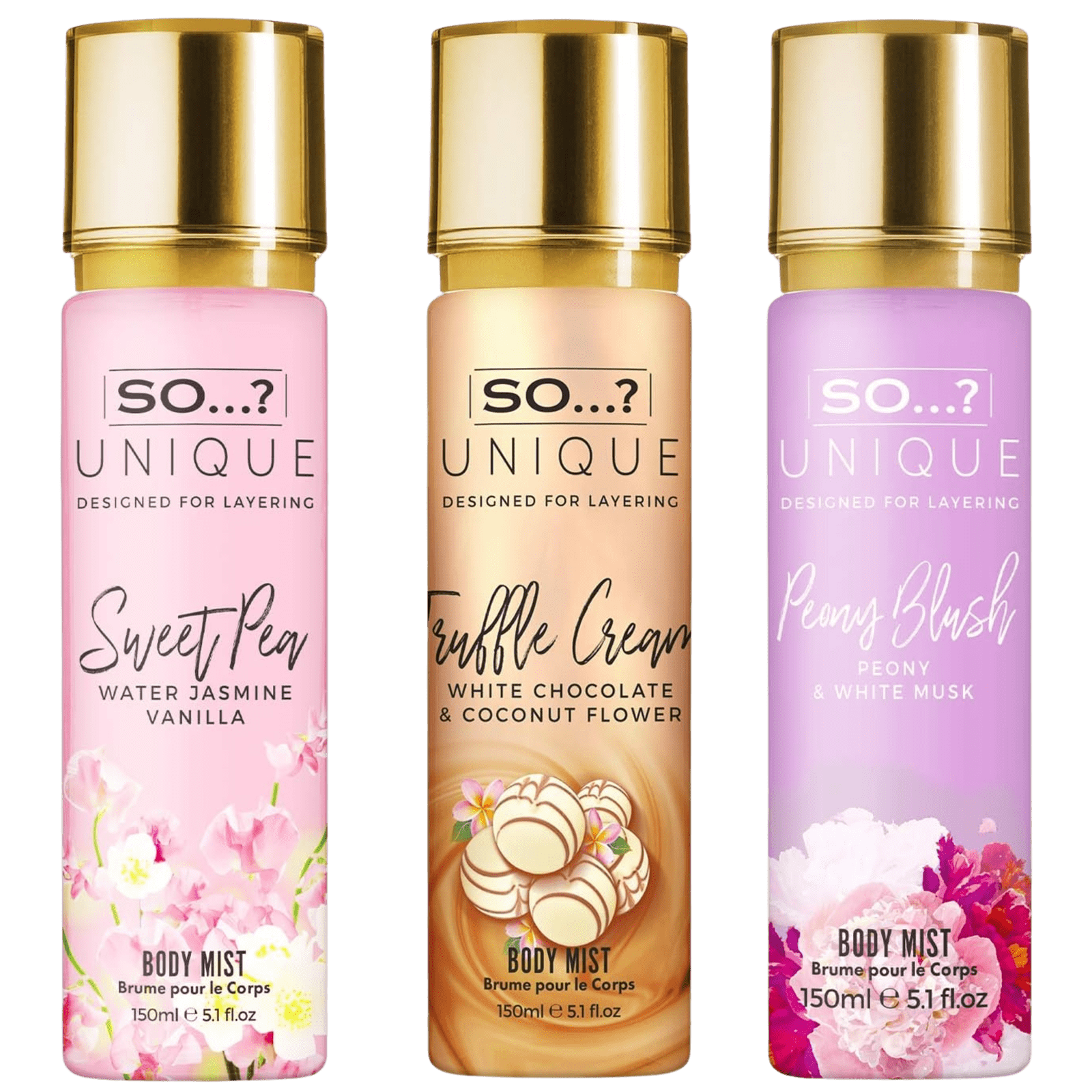 The So…? Unique Body Mist Mixed Fragrance Bundle offers a delightful trio of scents in 150ml bottles, featuring Sweet Pea, Truffle Cream, and Peony Blush. This Pack of 3 delivers long-lasting, refreshing fragrance mists that can be worn individually or layered for a custom scent. From the delicate floral notes of Peony Blush to the sweet and creamy essence of Truffle Cream, and the fresh floral scent of Sweet Pea, this bundle has a fragrance for every mood. Perfect for everyday use or as a thoughtful gift.