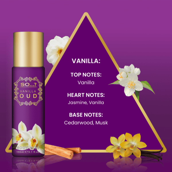 SO Vanilla Oud Body Mist Fragrance Spray for Women 150ml opens with notes of vanilla. At the heart lies jasmine, leading to a rich base of cedarwood and musk.