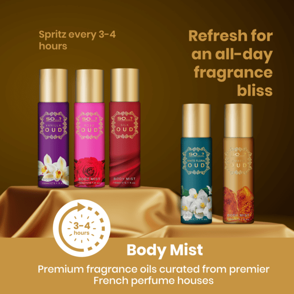 SO Vanilla Oud Body Mist Fragrance Spray for Women 150ml – Experience the luxurious allure of So…? Oud, a fragrance range crafted for women who adore rich, deep scents imbued with sophisticated, warming notes of Amber, Florals, Musk and Gourmand. Elevate your elegance and indulge in the captivating essence of these opulent Body Mists.